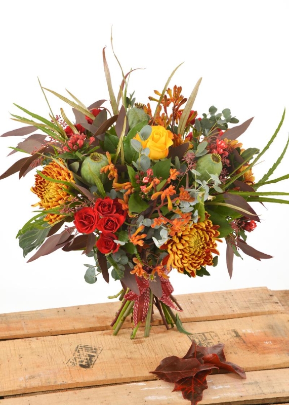 A rich harvest of large orange blooms with roses, poppy seed heads and seasonal red and oranges flowers for an autumn feast in a handtied bouquet presented with kraft paper and aqua pack in a box