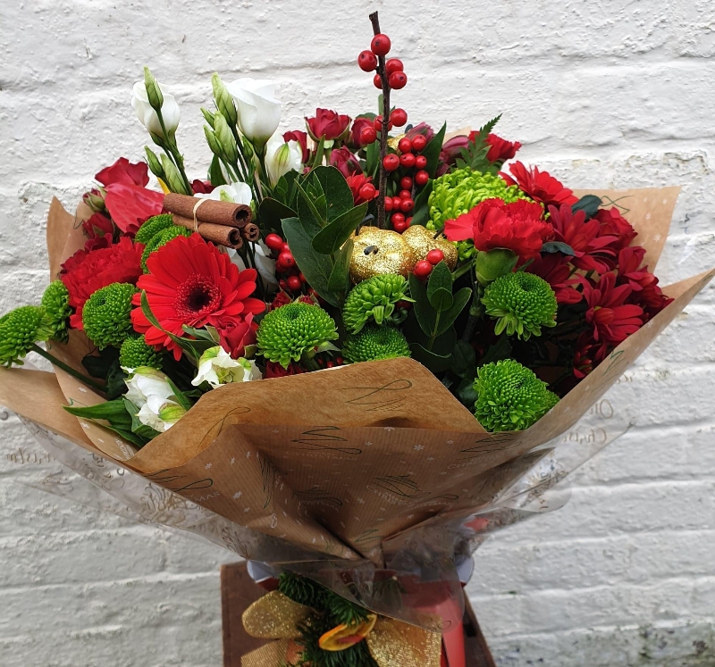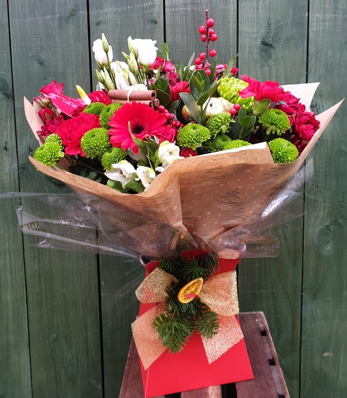 A magical Christmassy mix of flowers and seasonal foliage presented as a handtied aqua pack,  picked and made up by our florist making your bouquet with the freshest flowers in stock available on the day!