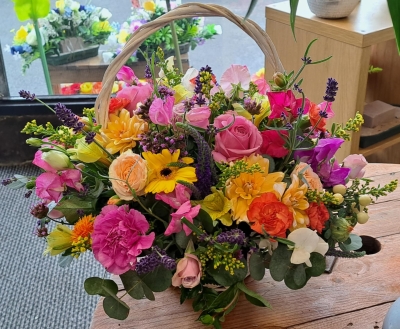 A basket of summer beauties, with bright colours to match a summer vibe. We work to create our designs with seasonal, local flowers and different floral stock , so there will be never 2 the same , but we will try to delight you with as many scented blooms we can.