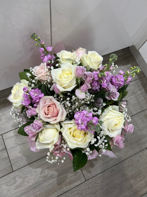 A selection of White & Pink Roses, with Purple Stocks. Lilac Spray Roses and Gyp.